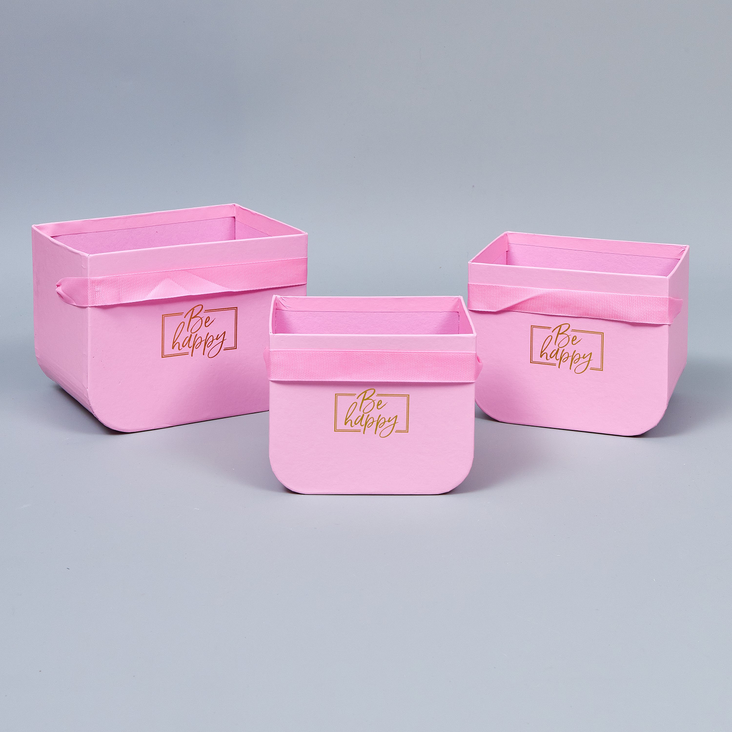 Набор коробок под цветы "Be happy" 3шт, L:16.5x12x12.5см, M:14x11x11.5см, S:12.5x9x10см, розовый